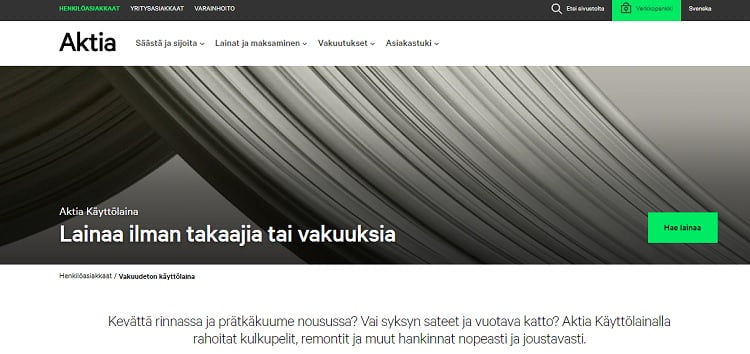 Aktia Pankki edellyttää, että lainanhakijalla ei ole maksuhäiriömerkintöjä.